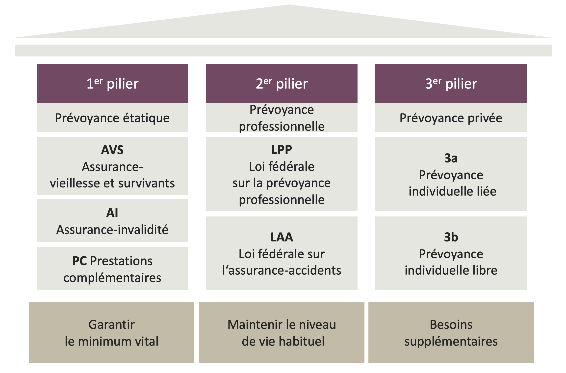En Suisse, la prévoyance vieillesse repose sur trois piliers. Ce concept vise à garantir une couverture complète des risques financiers en cas de décès, d'invalidité et de vieillesse. Les prestations du premier et du deuxième pilier sont financées conjointement par les employeurs et les salariés. Le troisième pilier est facultatif et à la discrétion de la personne assurée.