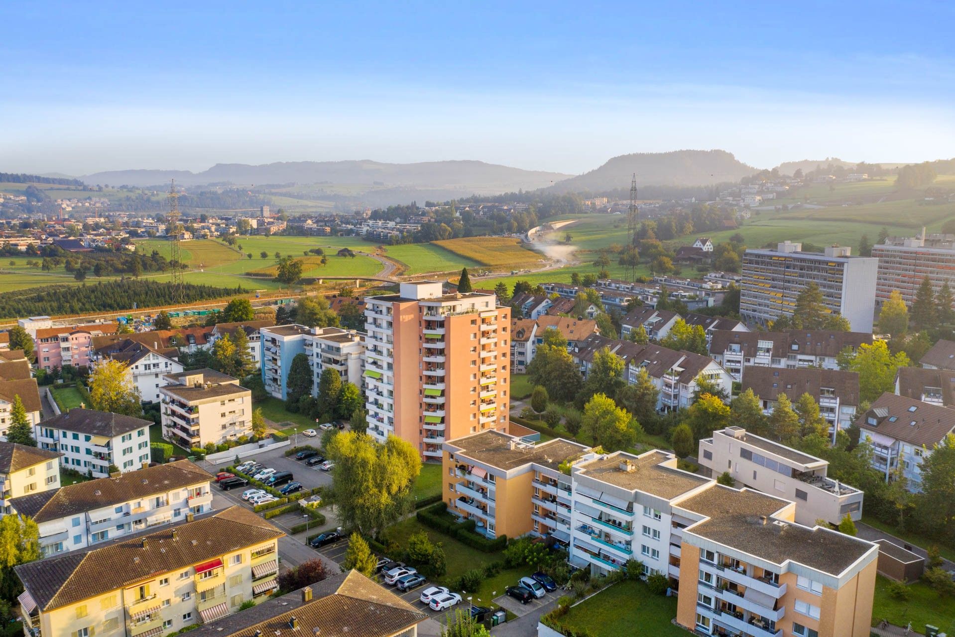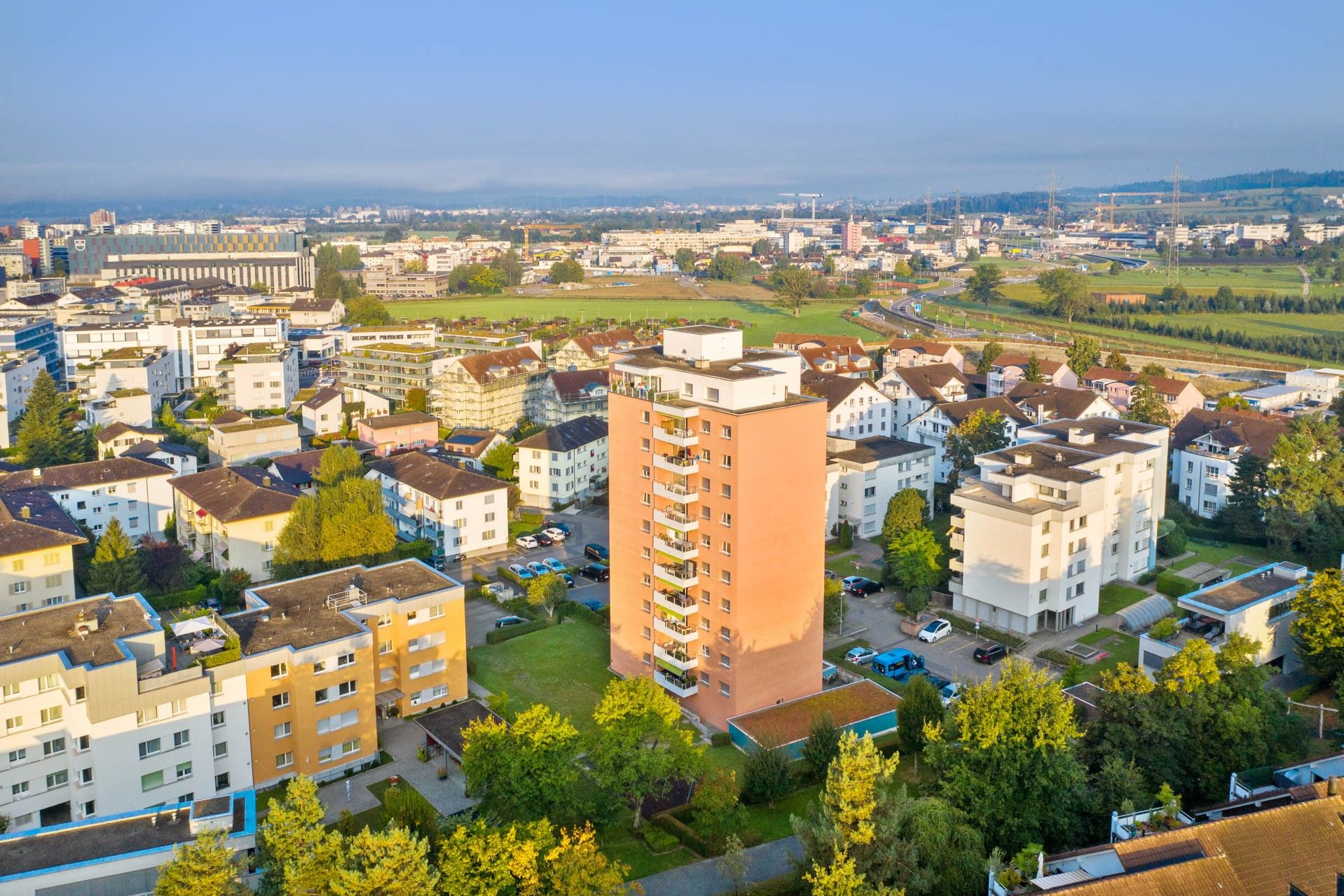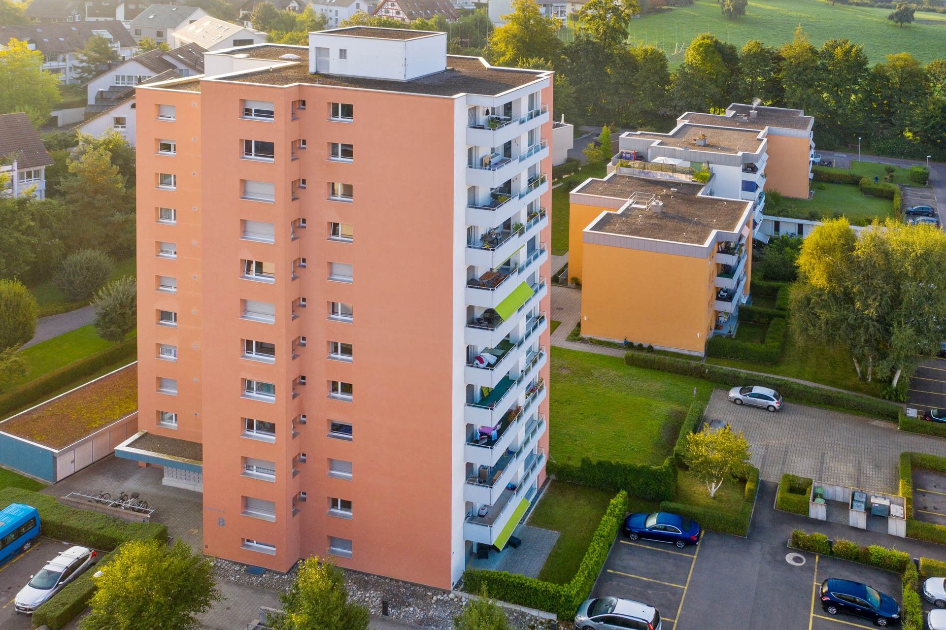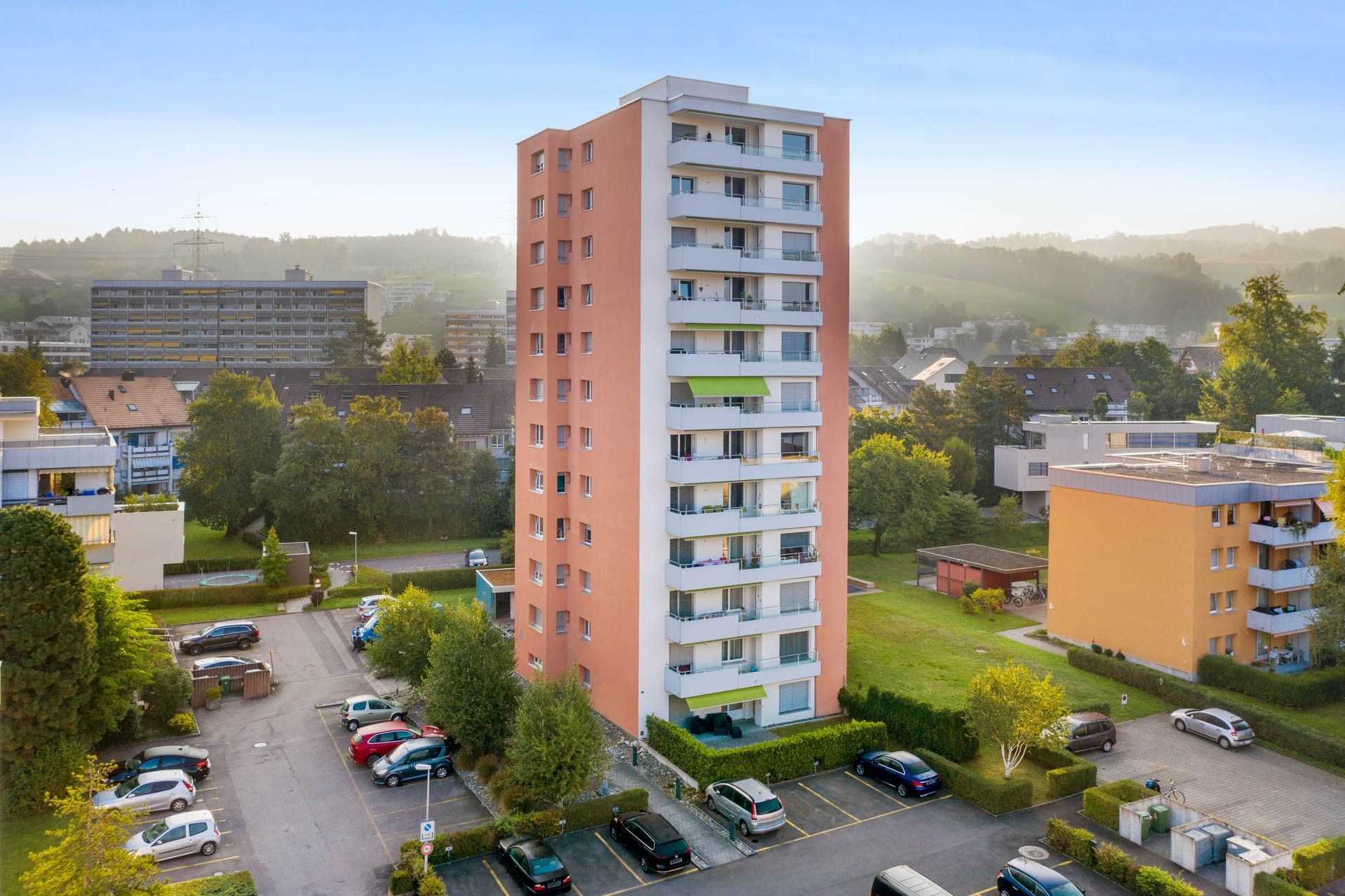 Das Hochhaus befindet sich in einer offenen Siedlungsstruktur mitten in einem ruhigen Wohnquartier mit grosszügigen Grünflächen. Fernsicht über den Zugersee und in die Innerschweizer Alpen.