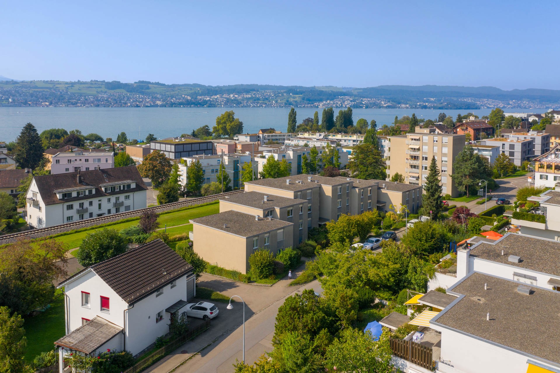 Die Mehrfamilienhäuser befinden sich oberhalb des Zürichsees, umgeben von grosszügigen Grünflächen mit Sitz- und Spielplätzen. Fernsicht auf den Zürichsee und zu den Alpen.