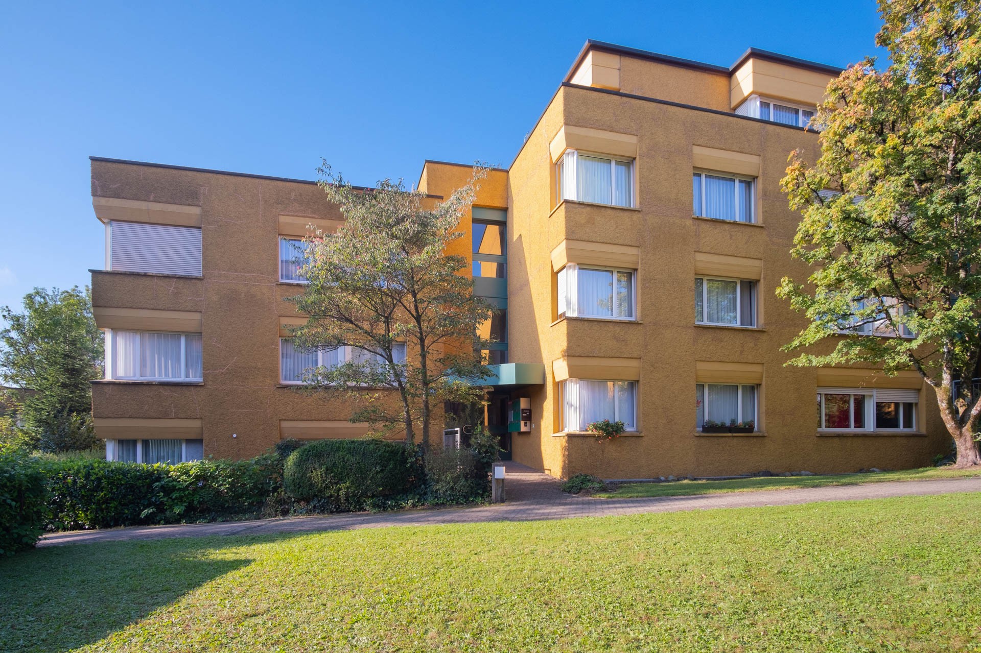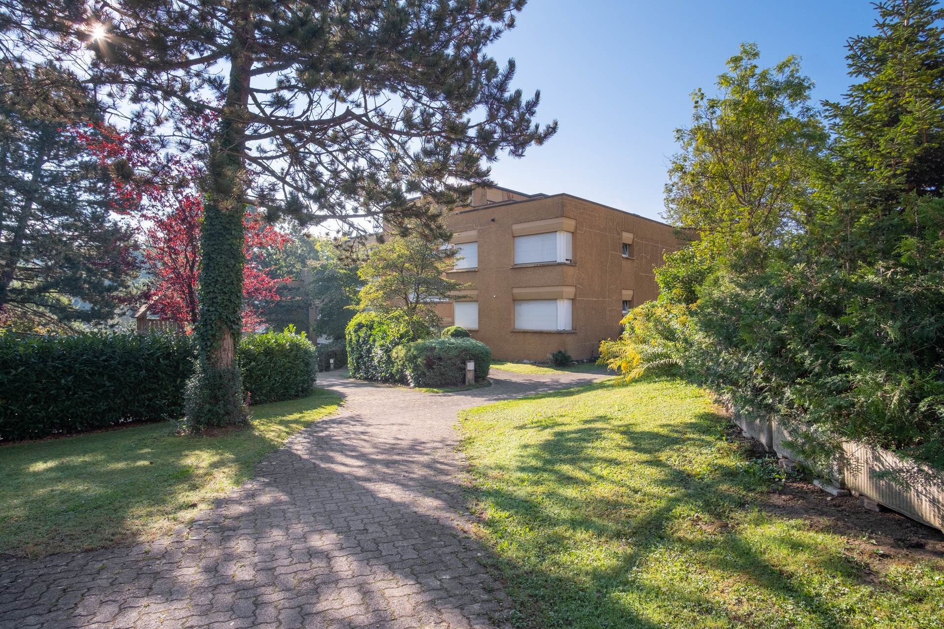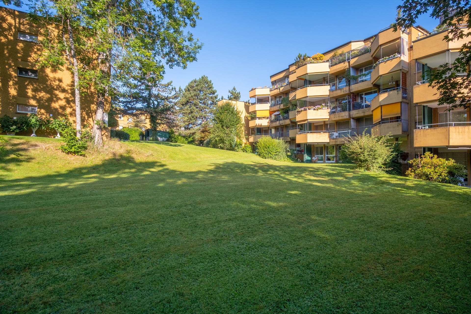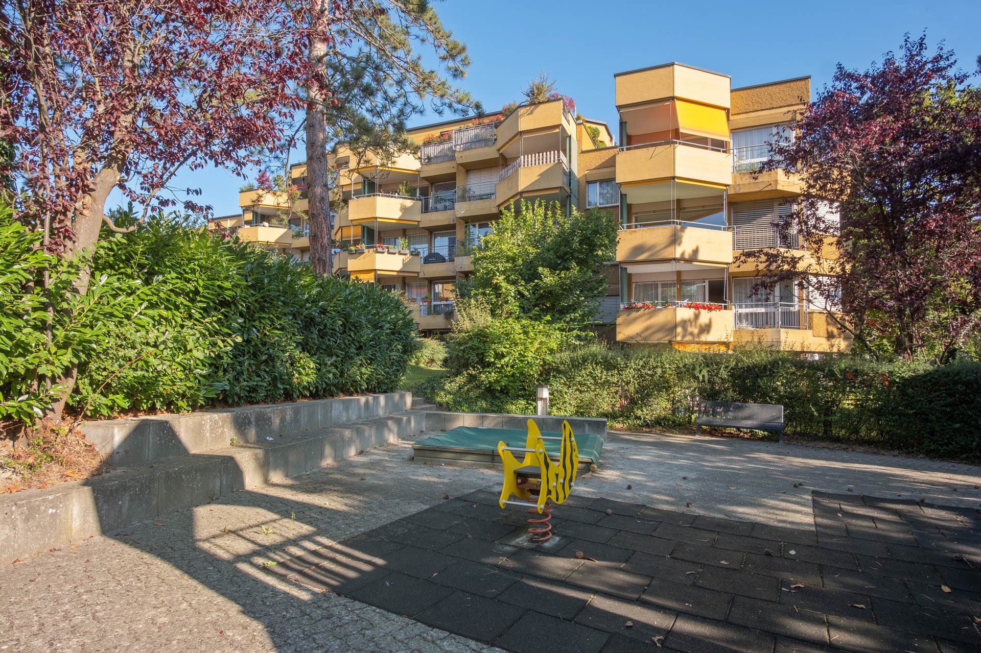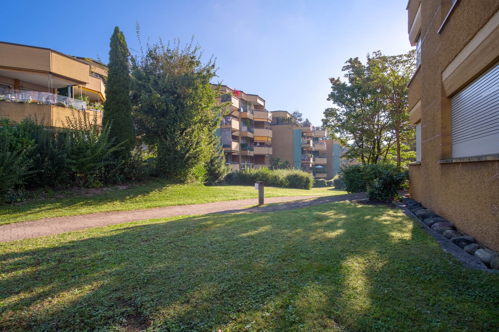 Die Überbauung besteht aus vier freistehenden, terrassierten Wohnhäusern mit grosszügigen Wohnungen. Die Liegenschaft befindet sich auf einem Areal mit Grünflächen, Spielplatz und altem Baumbestand.