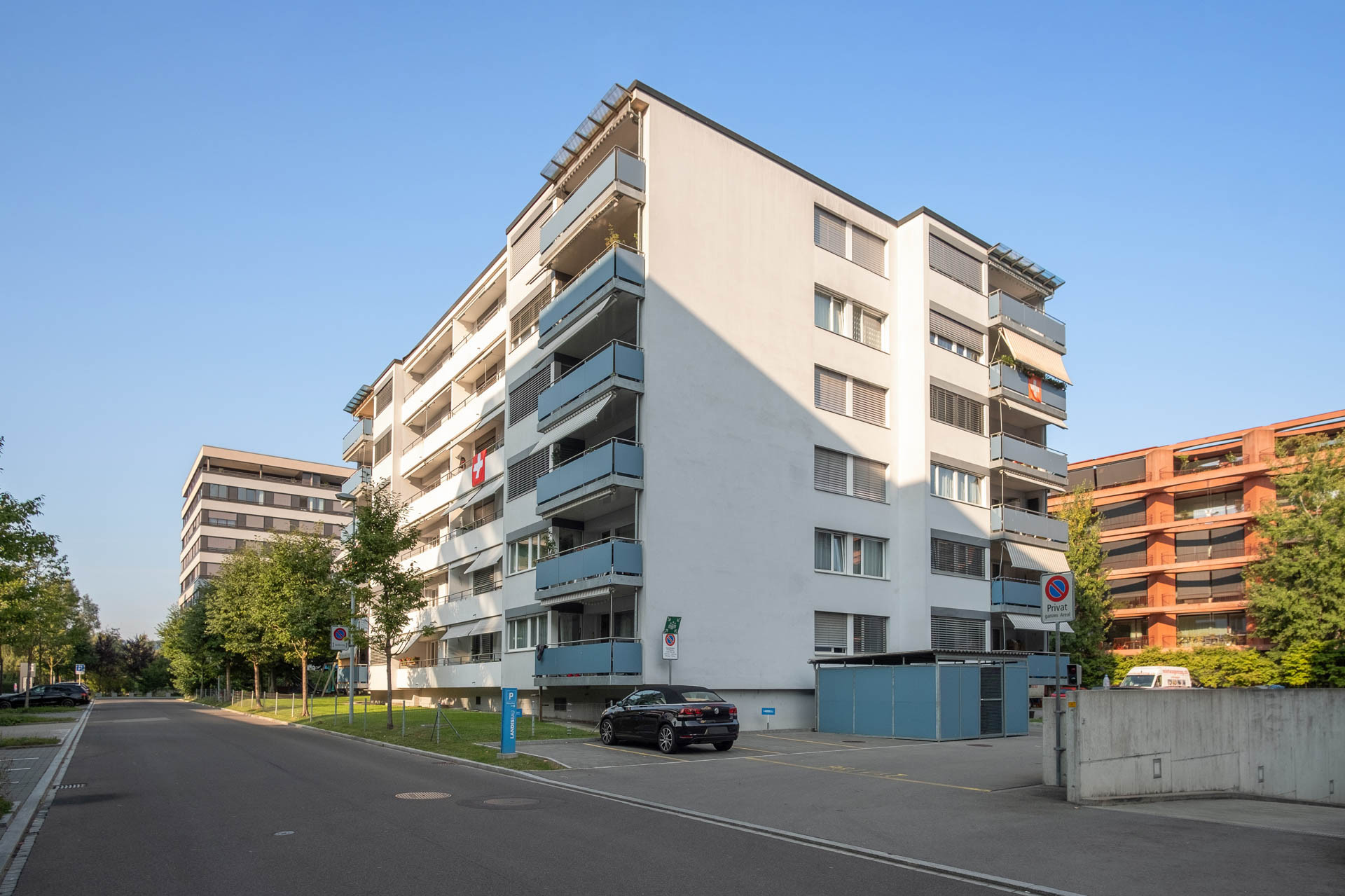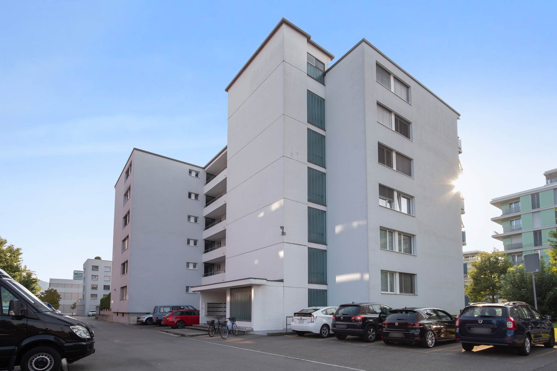 Das Doppel-Mehrfamilienhaus liegt zentral in Zug in einer offenen Siedlungsstruktur mit grosszügiger Grünfläche. In den oberen Etagen besteht Fernsicht auf den Zugersee und in die Berge.