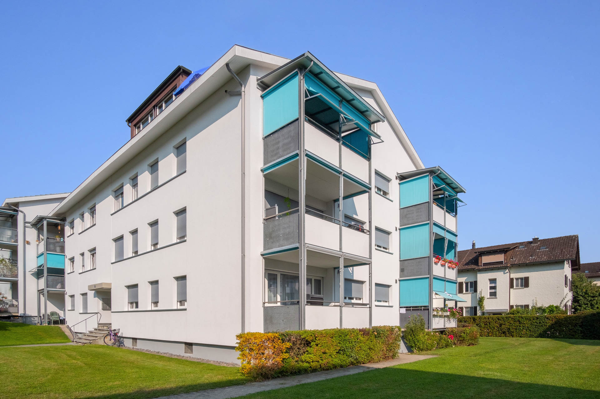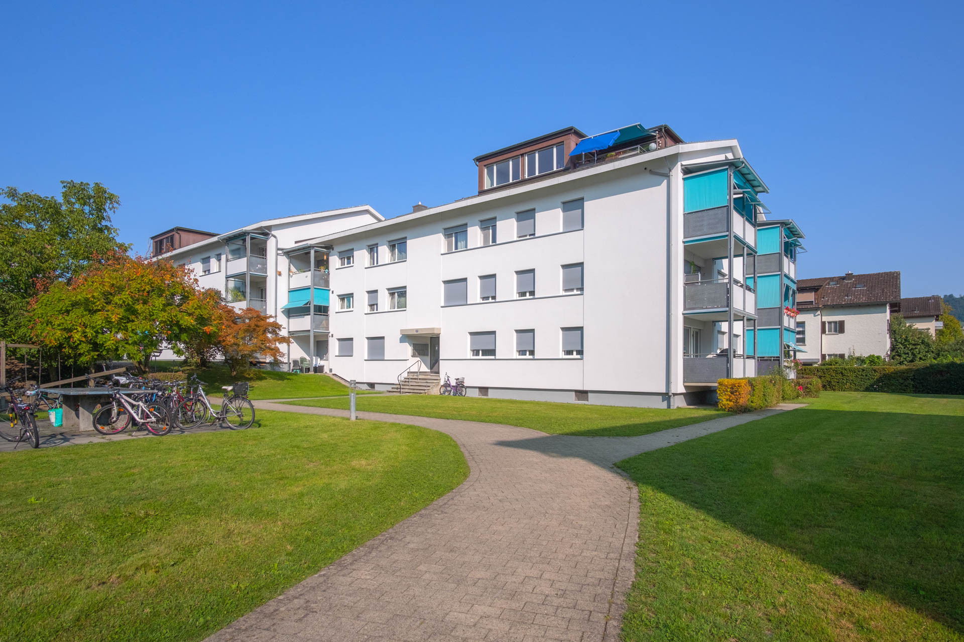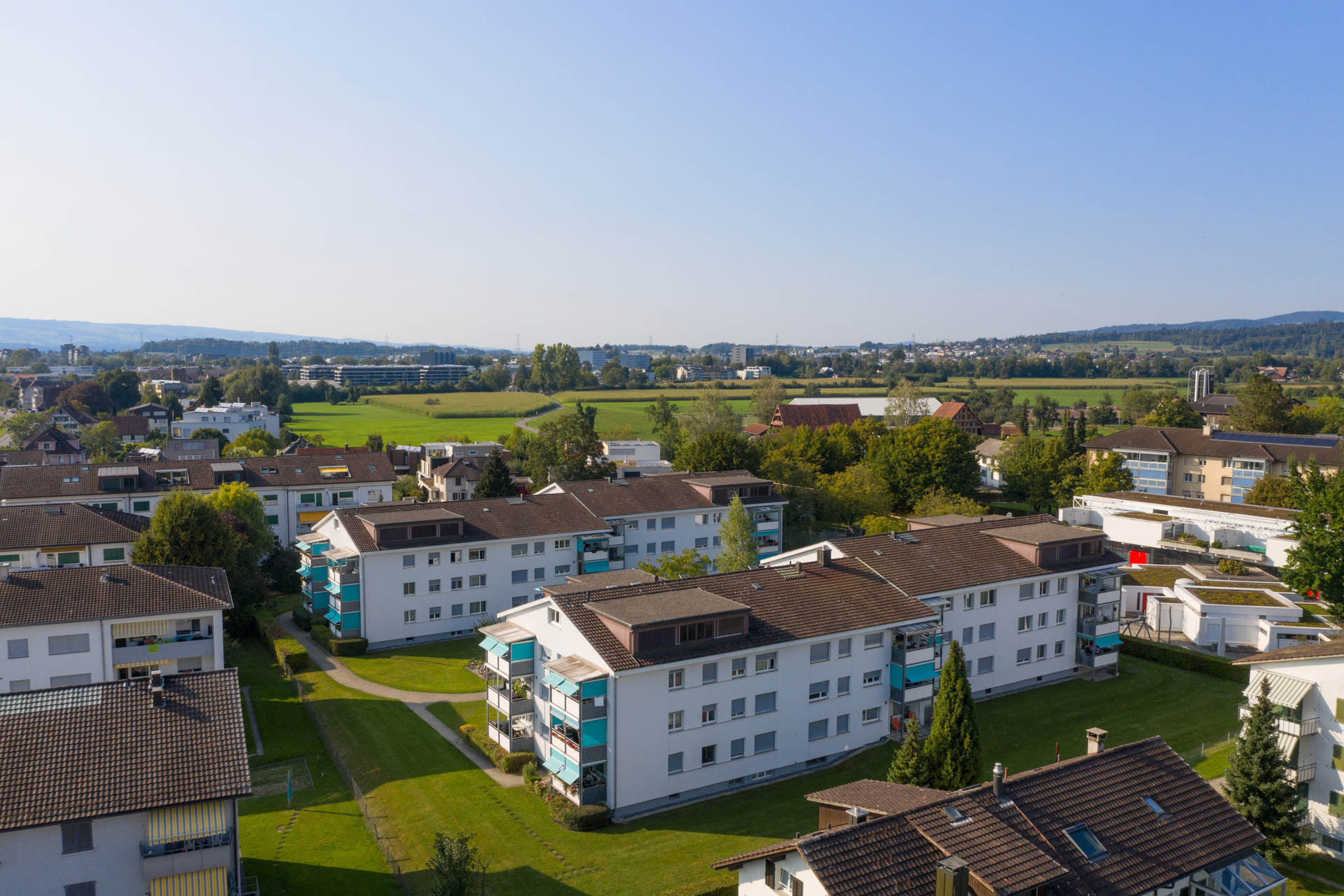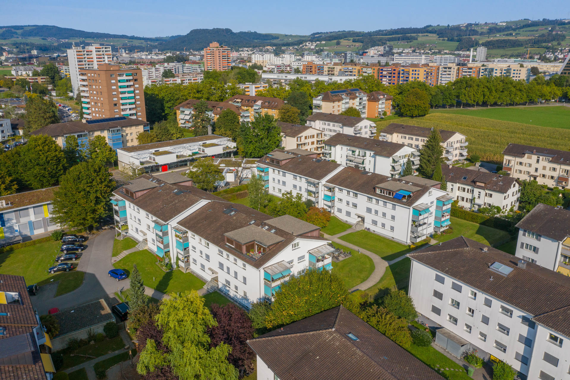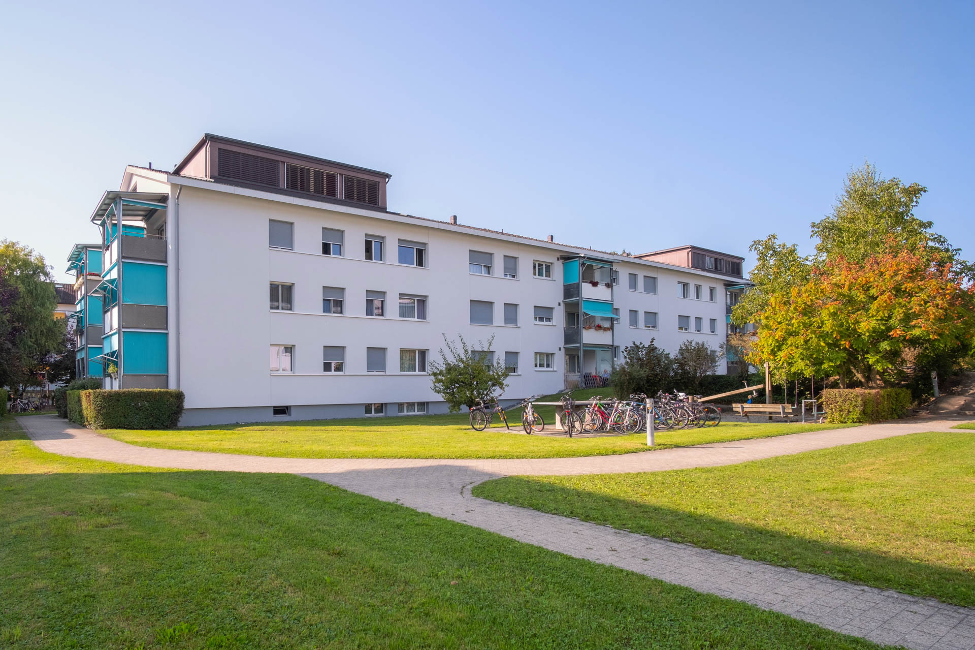 Die zwei Doppel-Mehrfamilienhäuser bieten grosszügige Wohnflächen; in den obersten Etagen besteht Fernsicht. Ein Kindergarten liegt in direkter Nachbarschaft.