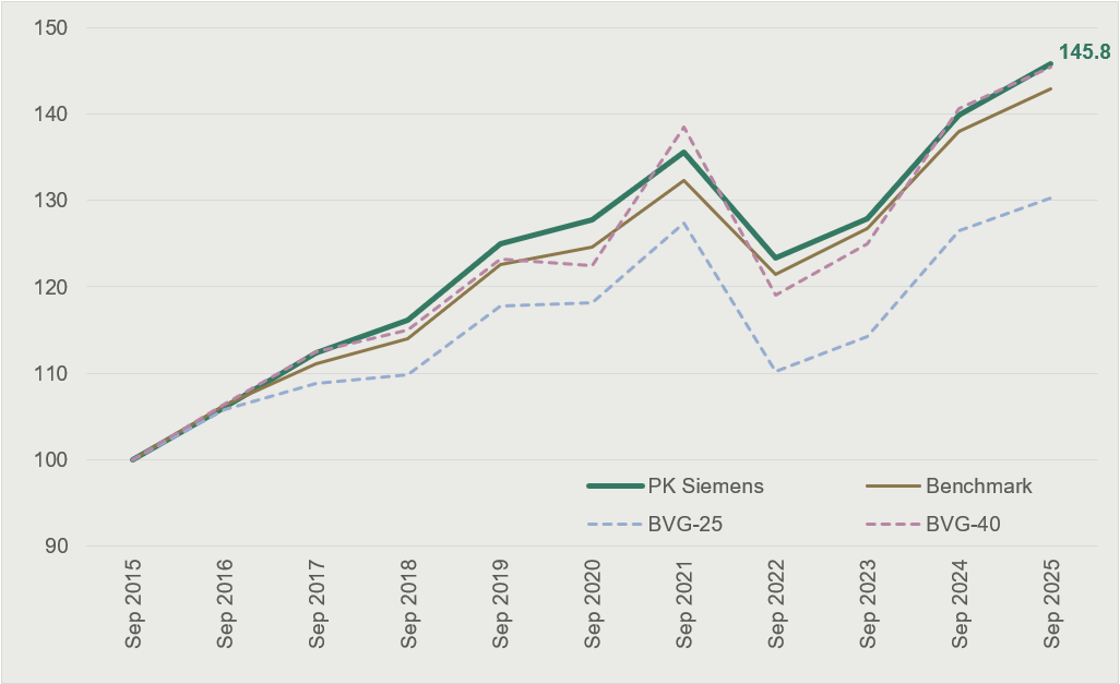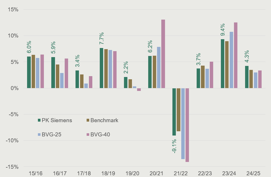 Die Performance zeigt die Wertentwicklung unseres Gesamtvermögens im Vergleich zur Anlagestrategie und zu den Vergleichsindizes BVG 25 und BVG 40.